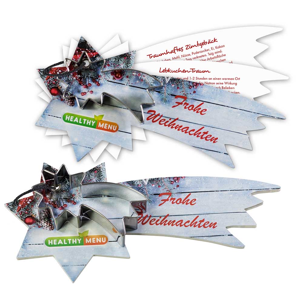 Leckere Backrezepte machen Lust auf die Weihnachtsbäckerei. Zusammen mit der Ausstechform aus spülmaschinenfestem Edelstahl, lassen sich himmlische Kekse zaubern. Das Deckblatt des Rezeptblocks wird mit Ihrer Werbebotschaft gestaltet.
