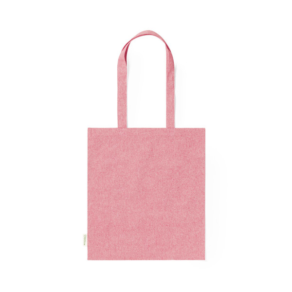 Tasche aus recyceltem Baumwollmaterial 140g/m2. GRS-Zertifizierung (Global Recycled Standard) die die recycelte Herkunft des für die Herstellung des Produkts verwendeten Materials garantiert. Genäht, mit 70 cm langen, verstärkten Griffen und in einer breiten Farbpalette erhältlich. Widerstandsfähigkeit bis zu 8 kg, einschließlich Etikett aus recycelter Baumwolle.