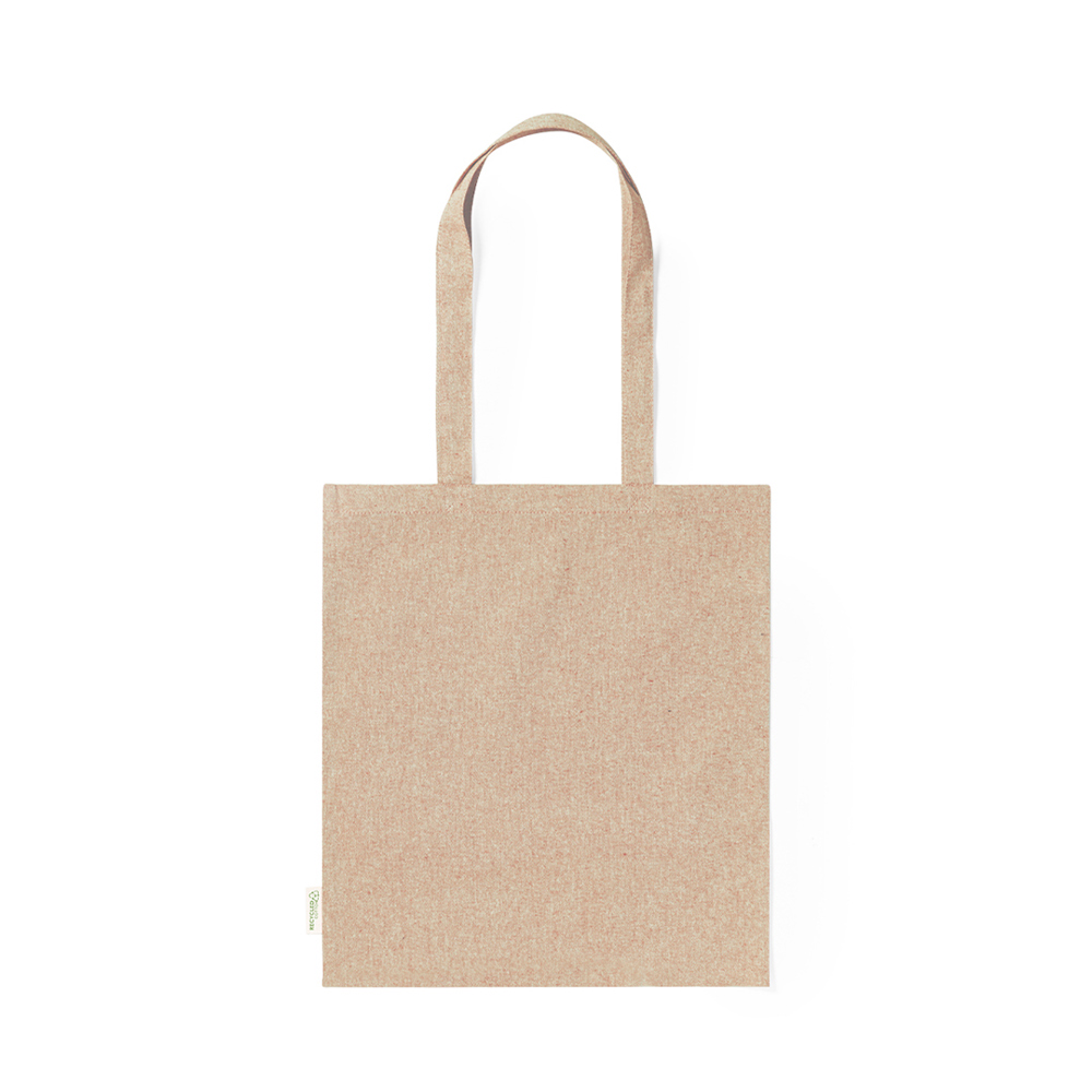 Tasche aus recyceltem Baumwollmaterial 140g/m2. GRS-Zertifizierung (Global Recycled Standard) die die recycelte Herkunft des für die Herstellung des Produkts verwendeten Materials garantiert. Genäht, mit 70 cm langen, verstärkten Griffen und in einer breiten Farbpalette erhältlich. Widerstandsfähigkeit bis zu 8 kg, einschließlich Etikett aus recycelter Baumwolle.