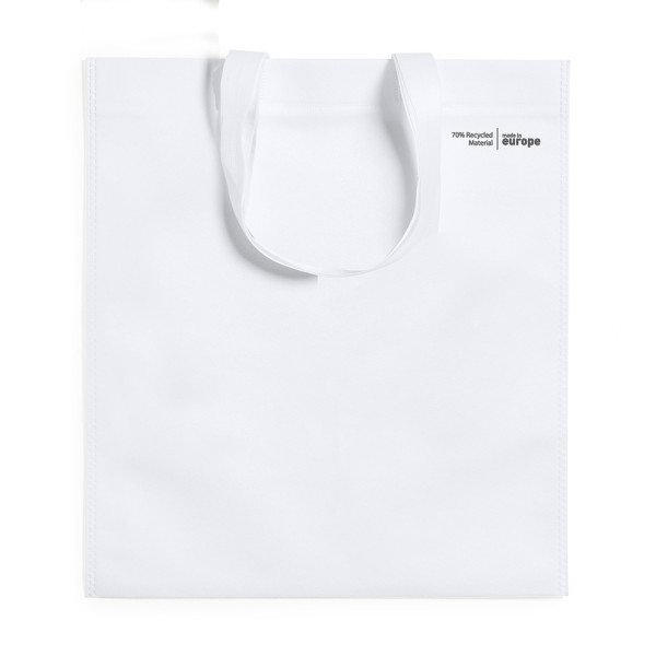 Nature Line Tasche aus recyceltem Non-Woven 70g/m2. In Europa hergestellt, mit heißversiegelter Oberfläche, kurz Griffen und Öko-/Made-in-Label auf der Tasche.