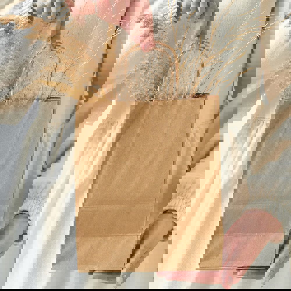 Kraftpapiertasche mit Griffen aus gedrehtem Papier. FSC-zertifiziert und in Europa hergestellt.