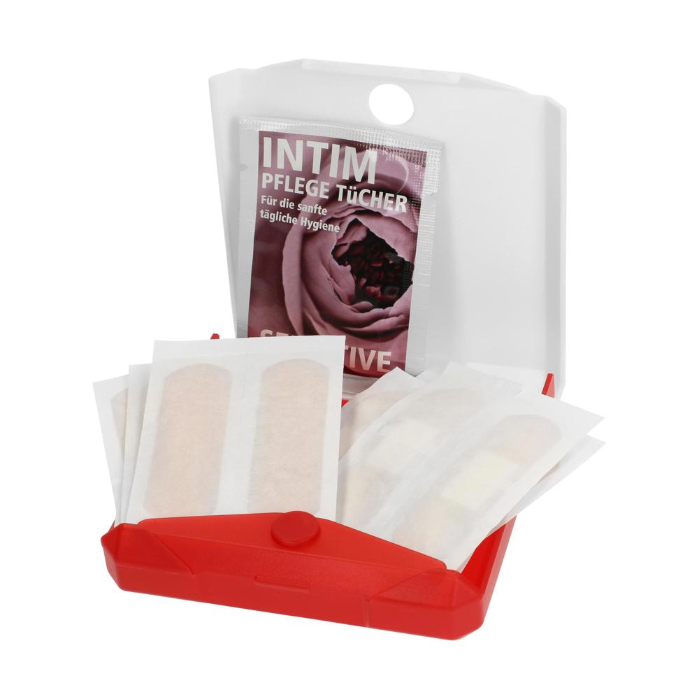 Quadratische, praktische Box aus Kunststoff mit Klickverschluss, der sich auch ganz leicht mit einer Hand öffnen lässt. Befüllt mit 10x 2er Pflastersets und 1 Hygienetuch.
