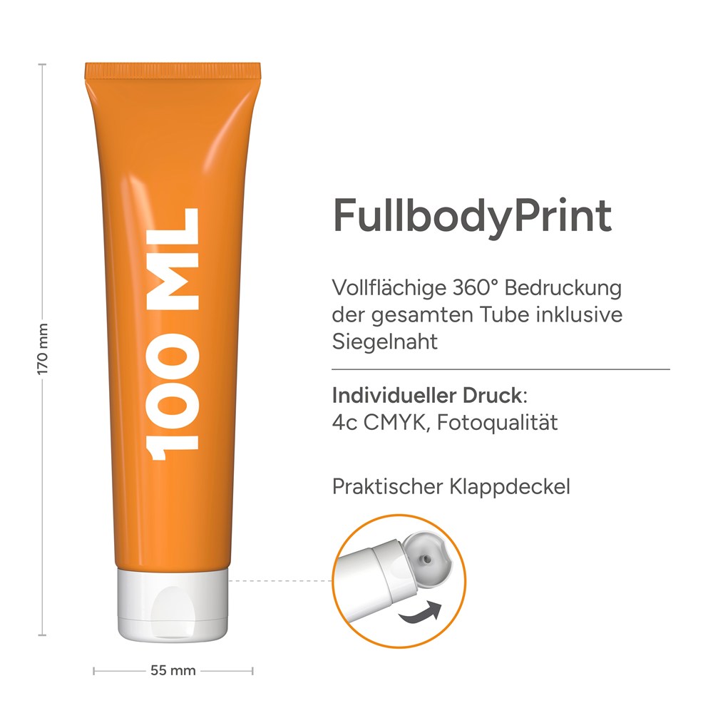 FullbodyPrint: Vollflächige 360° Bedruckung der gesamten Tube inklusive Siegelnaht. Der Druck erfolgt direkt auf die Tube in atemberaubender 4c Fotoqualität (CMYK). Keine extra Druckkosten pro Stück: der Druck auf die Tube ist im Preis bereits inbegriffen.