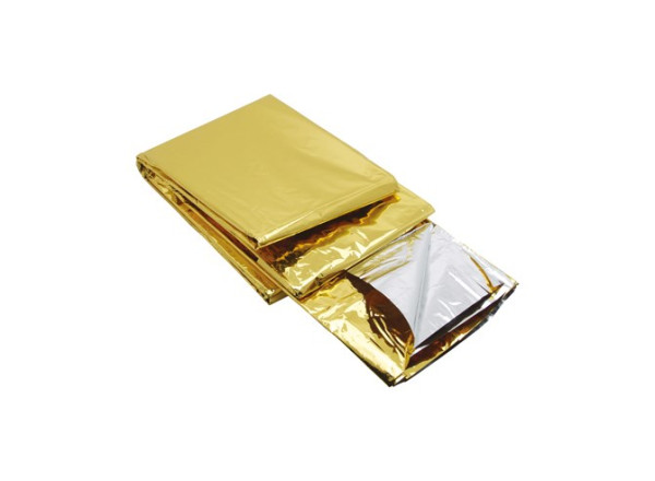 Größe: 200 x 120 cm. Dicke: 12 Mikrometer. Hält 90 % der Wärmestrahlung zurück. Eine silberne Oberfläche / eine goldene Oberfläche. Die silberne Oberfläche (nach außen gewendet) reflektiert Wärmestrahlen und isoliert vor Hitze (effektive Klimatisierung eines Zeltes, eines Wohnwagens, oder eines Autos). Die goldene Oberfläche (nach außen gewendet) isoliert vor Feuchtigkeit, Kälte und Regen (erhält die Körpertemperatur in Notfallsituationen).
