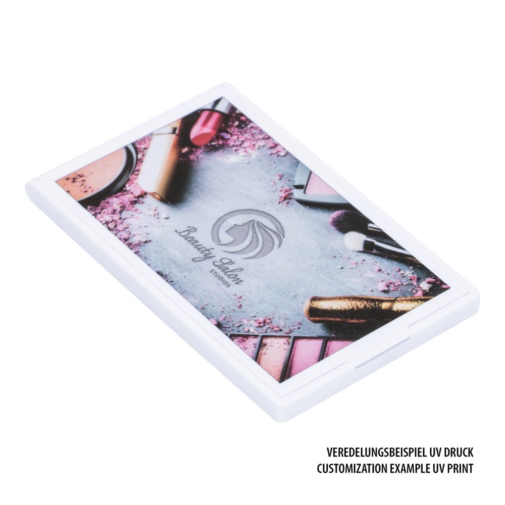 Dieser handliche Taschenspiegel lässt sich wunderbar verschließen und schützt so das einseitige Spiegelglas gegen Stöße und Kratzer. Der leichte, rechteckige Taschenspiegel ist aus weißem Kunststoff und die Außenseite ideal für einen vollflächigen UV-Druck. Alternativ können Sie den Artikel mit einem ein- bis vierfarbigen Tampondruck mit Ihrem Logo oder Ihrer Grafik bedrucken lassen.