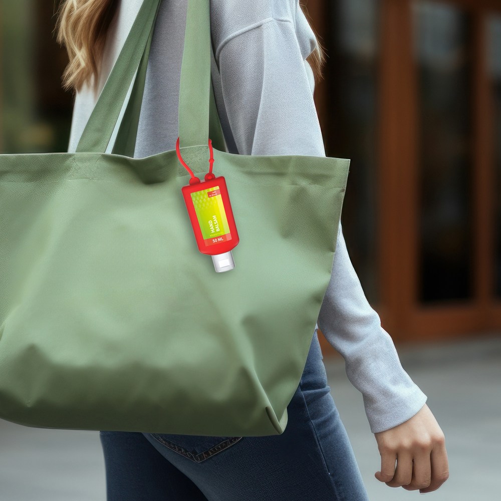 50 ml Flasche und Klappdeckel (zufällig ausgerichtet) weiß; Silikonhülle und Schlaufe in rot. Nachfüllbar. Flasche hergestellt aus 100% recyceltem PET, weiß mit leichter R-PET-Färbung.