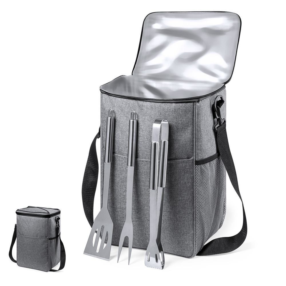 Grillset mit 3 Zubehörteilen. Einschließlich: Tragetasche/Kühlbox aus widerstandsfähigem RPET 300D-Polyester, hergestellt aus recyceltem Kunststoff, der die Wiederverwendung von Kunststoffabfällen fördert und zur Nachhaltigkeit unseres Planeten beiträgt. Mit verstellbarem Schultergurt und Karabinerhaken, einschließlich isothermischem PEVA-Innenraum, um das Essen auf der richtigen Temperatur zu halten. RPET-Logo auf dem Außenetikett.Spatel, Zange und Gabel aus Metall, mit schwarzen Griffen.
