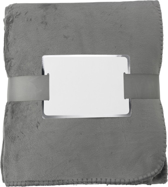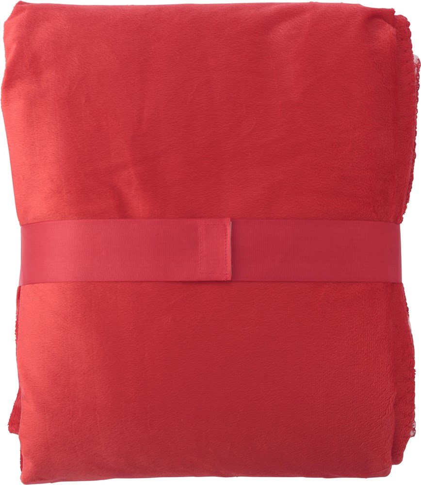 Kuscheldecke aus Polyester, mit Verschlussband und Label für die Werbeanbringung.